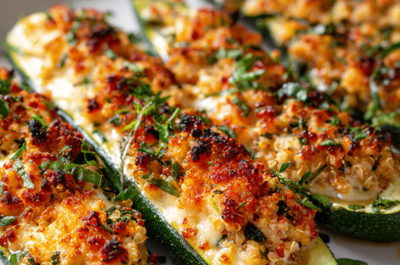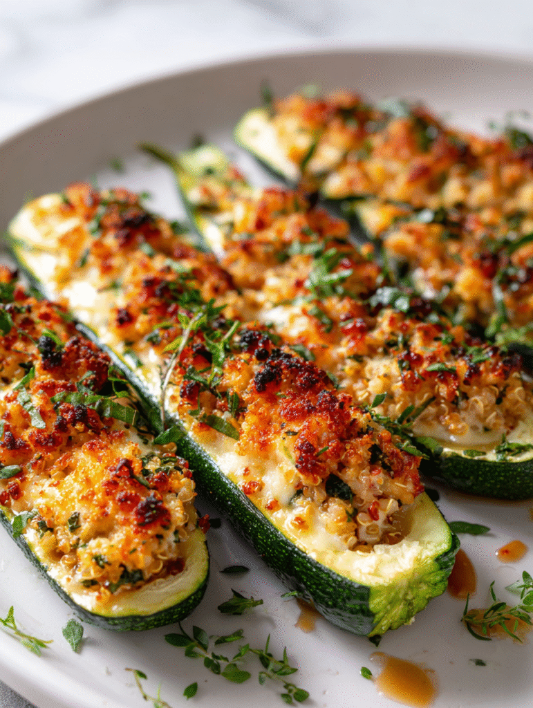 Let the stuffed zucchini rest for 5 minutes before serving. Garnish with fresh herbs for color and aroma. Serve warm, spooning any melted cheese and juices over each plate.