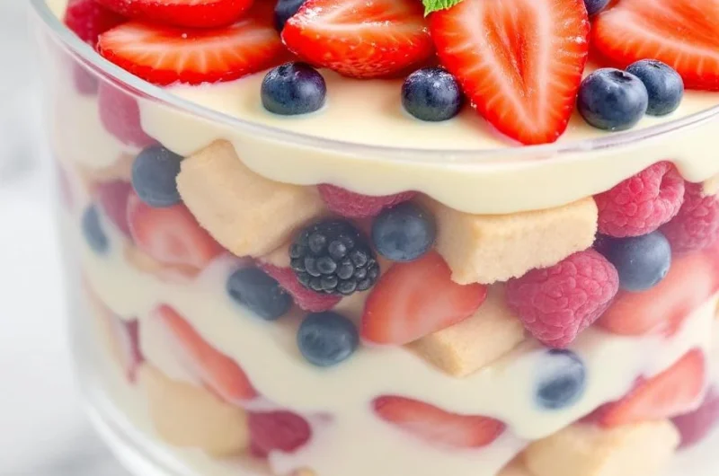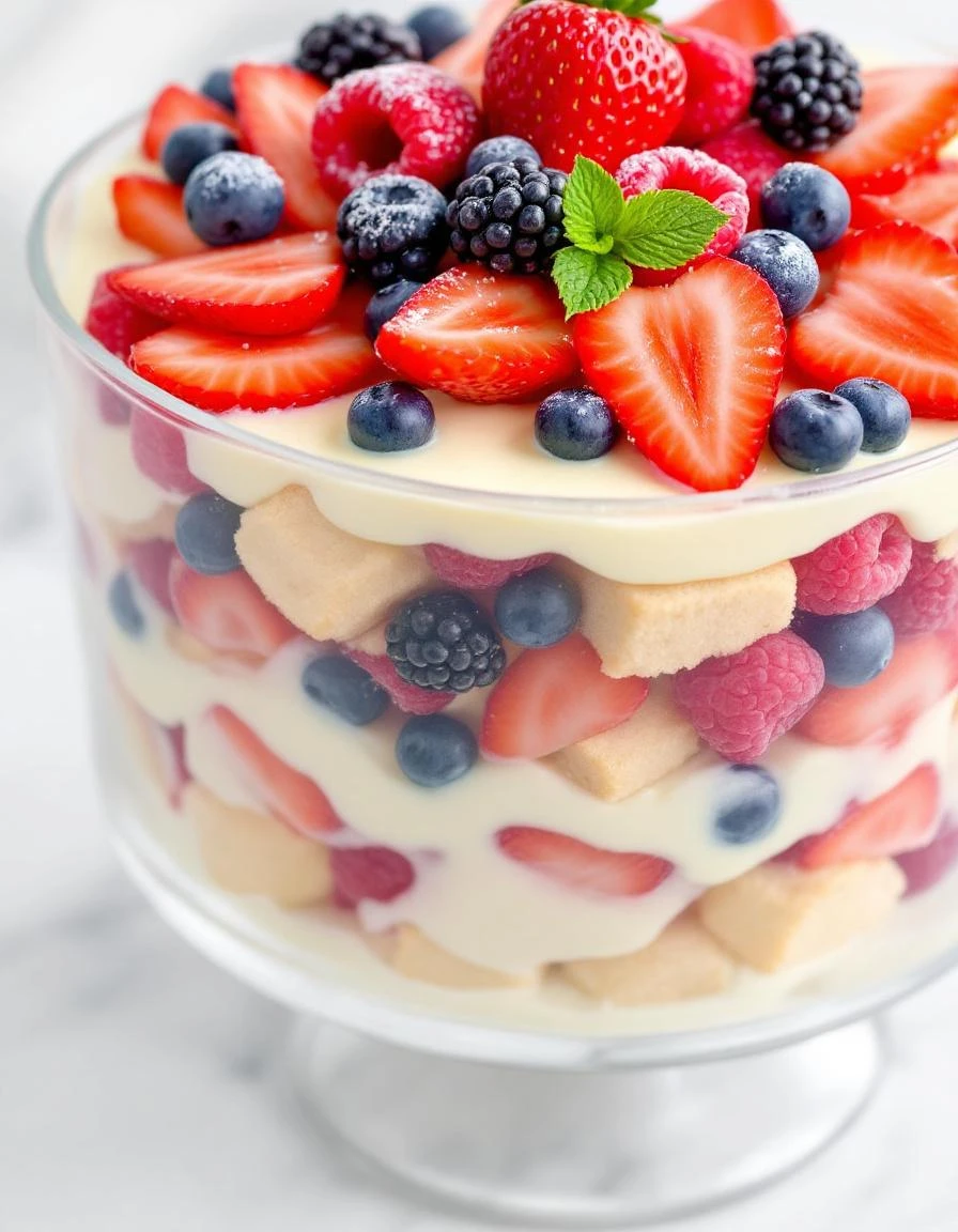 Berry trifle is a layered dessert featuring fresh berries, ladyfingers or sponge cake, and smooth vanilla custard, assembled in a glass dish. The dish combines soft textures with juicy fruit, creating a visually appealing and refreshing treat with a luscious, creamy finish. Its hands-on layering process makes it both a fun and elegant summer dessert.