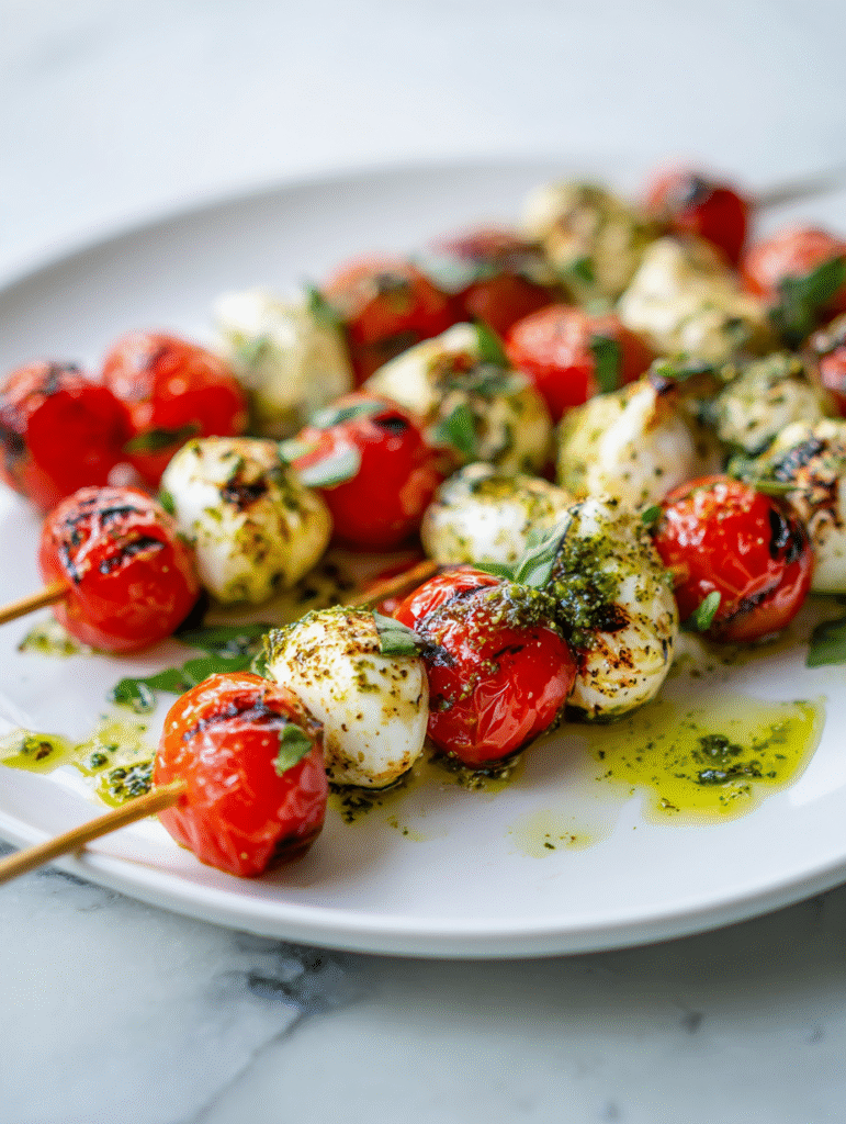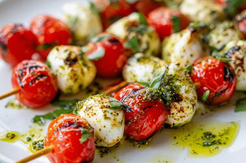 These grilled Caprese skewers are a fresh, portable take on the classic salad, featuring juicy cherry tomatoes, creamy mozzarella, and fragrant basil leaves threaded onto skewers. Grilled briefly to bring out smoky flavors and a slight char, then finished with a drizzle of basil oil and balsamic glaze for a vibrant, summery appetizer or snack.