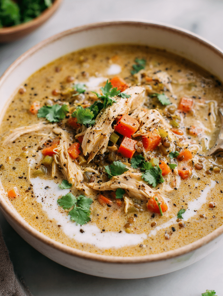 - Once the soup is ready, ladle it into bowls and garnish with fresh herbs or a swirl of coconut milk for extra richness. The soup should be fragrant, with tender chicken and soft lentils in a vibrant, golden broth.