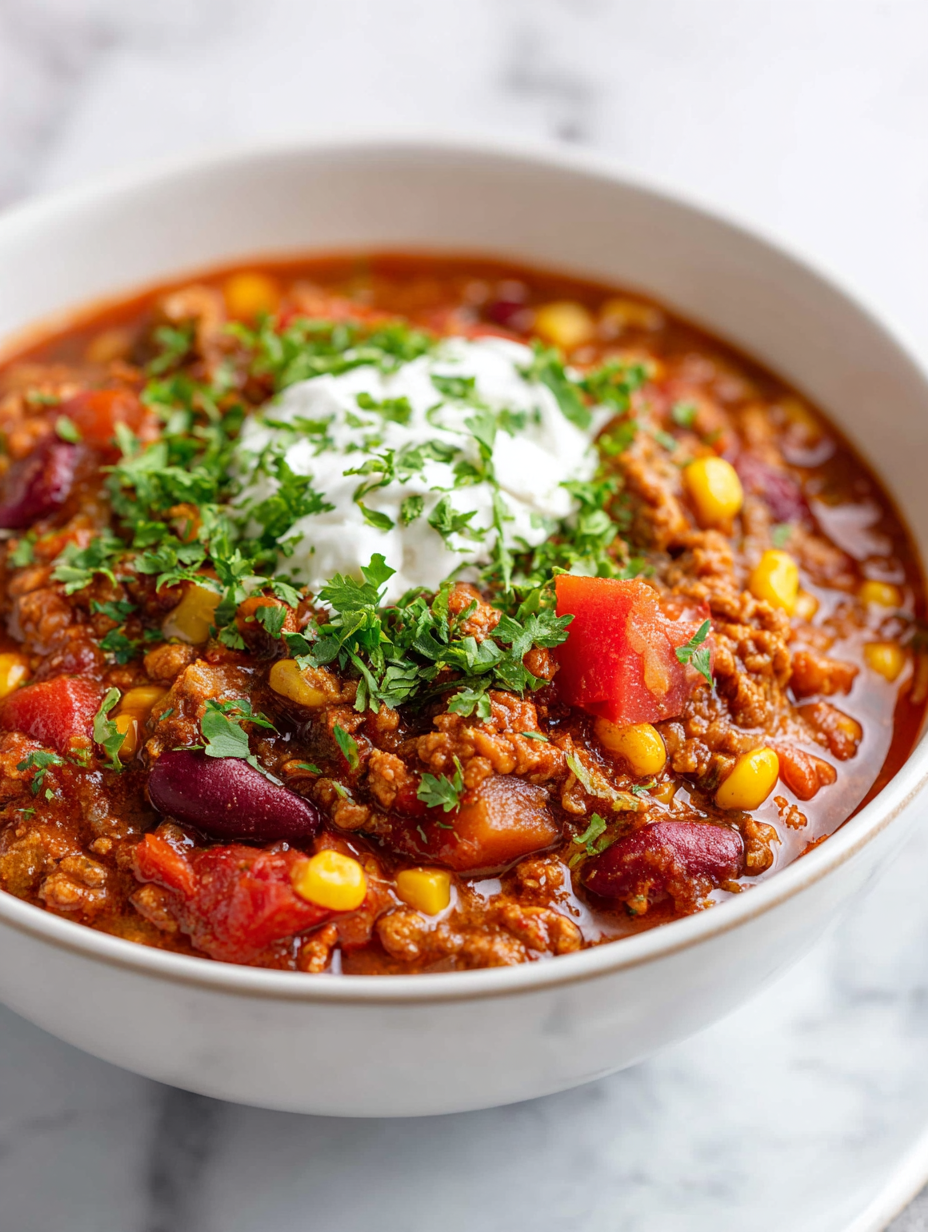 - Taste the chili and adjust seasoning if needed—adding more chili powder or a squeeze of lime for brightness. Ladle into bowls and garnish with chopped cilantro, a dollop of sour cream, or lime wedges for extra flavor.
