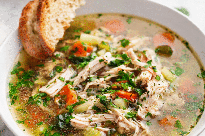 This hearty chicken soup is made by simmering chicken thighs with carrots, celery, garlic, and herbs in flavorful broth until tender. The dish features a clear, comforting broth with shredded chicken and soft vegetables, offering a warm, nourishing bowl free of dairy. Brightened with lemon juice, it boasts a vibrant, wholesome finish.