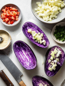 - Using a sharp serrated knife, carefully slice each eggplant in half lengthwise. Scoop out the flesh with a spoon or melon baller, leaving about 1 cm of shell intact—this creates a sturdy vessel for the stuffing.