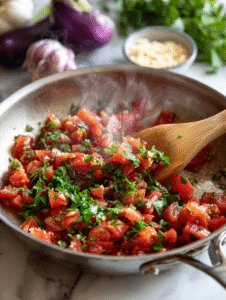 Step 3: Chop the scooped eggplant flesh finely. Mix with diced tomatoes, garlic, herbs, salt, and pepper.