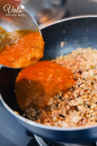 5. Drain any excess grease from the pot, then pour in the vegetable stock and marinara sauce and bring the mixture to a boil.