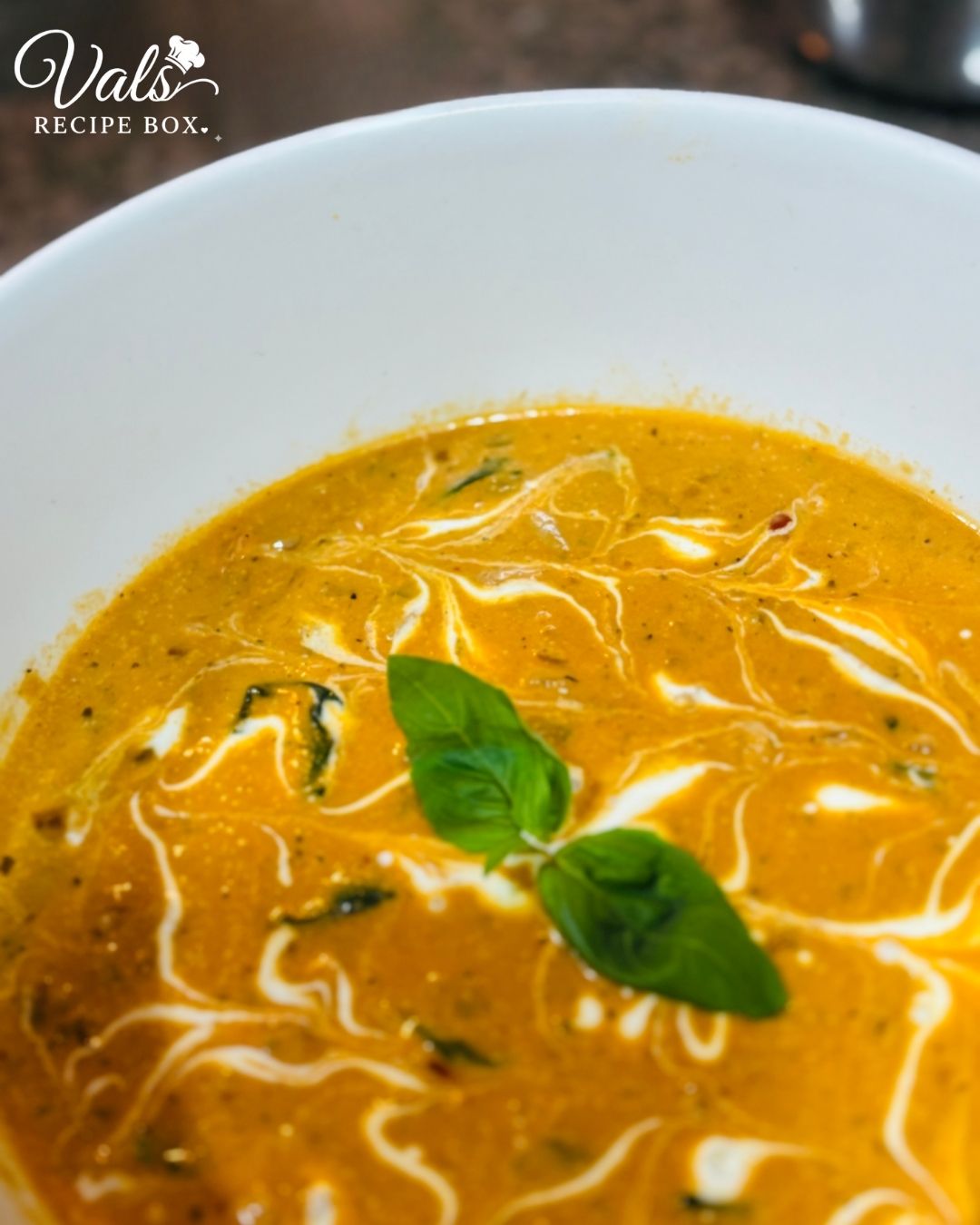 7. Taste and adjust salt and pepper. Stir in the heavy cream and heat gently for 2–3 minutes without boiling. Ladle into bowls and top with ricotta, Parmesan, and fresh basil.