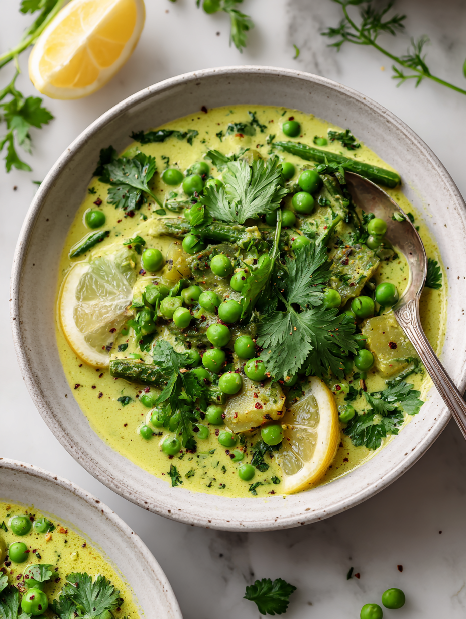 10. Serve the green pea curry hot over steamed rice or with crusty bread. Garnish with fresh herbs if desired, and enjoy the bright, comforting flavors.