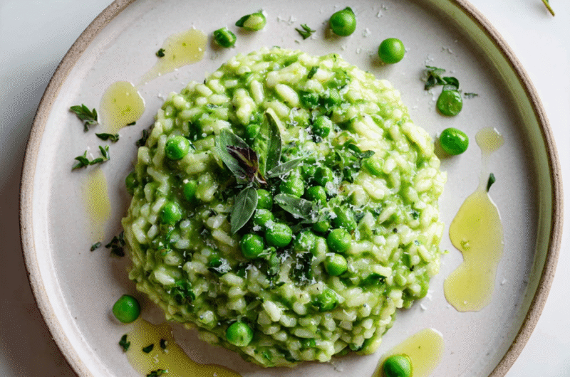 Let the risotto rest for 2 minutes off heat, then serve immediately. Finish with a sprinkle of Parmesan and a drizzle of olive oil if desired. The dish should be velvety, with a slight bite to the rice and bursts of sweet pea flavor in every spoonful.