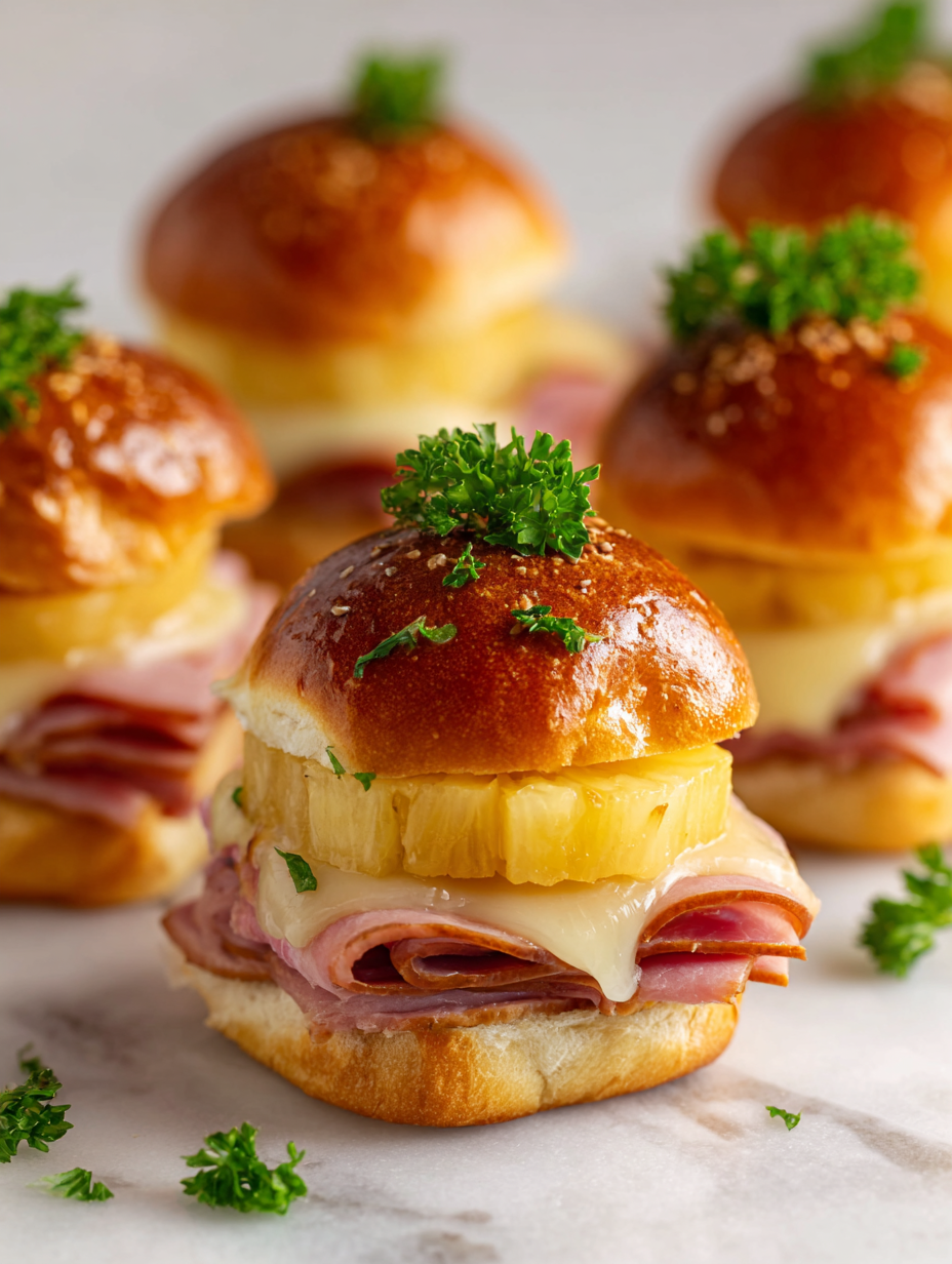 Focusing on the nostalgic, tropical vibe that transforms simple sliders into a vacation-for-the-mouth experience, highlighting the interplay of smoky ham, sweet pineapple, and tangy sauces.