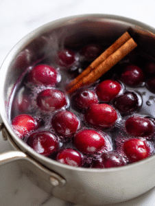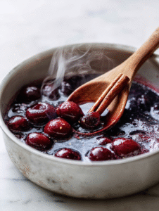 Step 6: While roasting, prepare the cherry glaze: simmer pitted cherries, a splash of red wine, a cinnamon stick, and a teaspoon of honey.