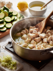 - Start by chopping the chicken breasts into bite-sized pieces and slicing the zucchini thinly for quick cooking.