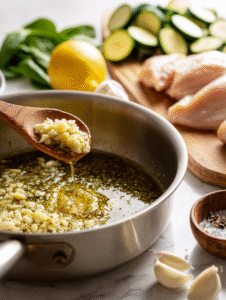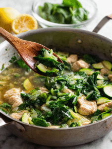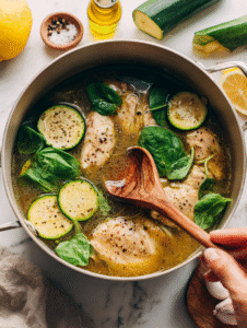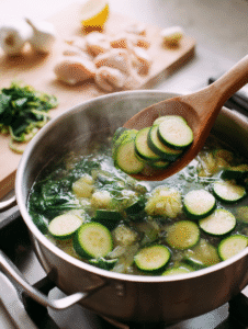 Step 4: Pour in chicken broth, bring to a gentle simmer, and add your choice of keto-friendly vegetables like zucchini and spinach.