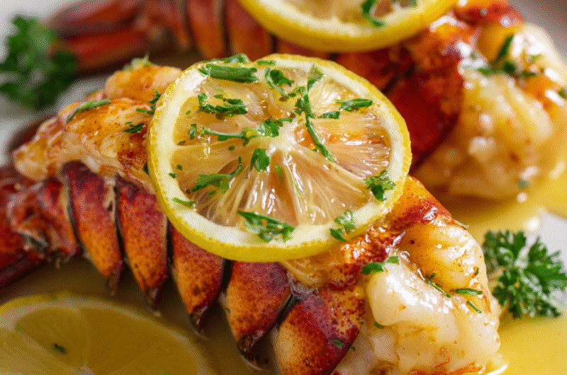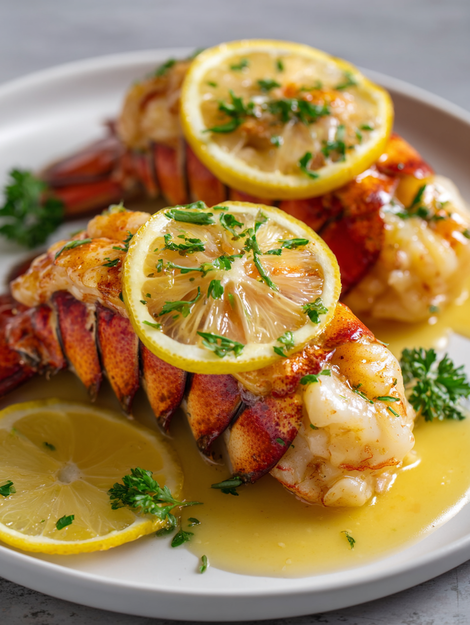 Let the lobster rest for 2-3 minutes after baking. Drizzle with final lemon butter and a squeeze of lemon. Garnish with herbs and serve immediately to enjoy the bright, buttery flavors at their peak.