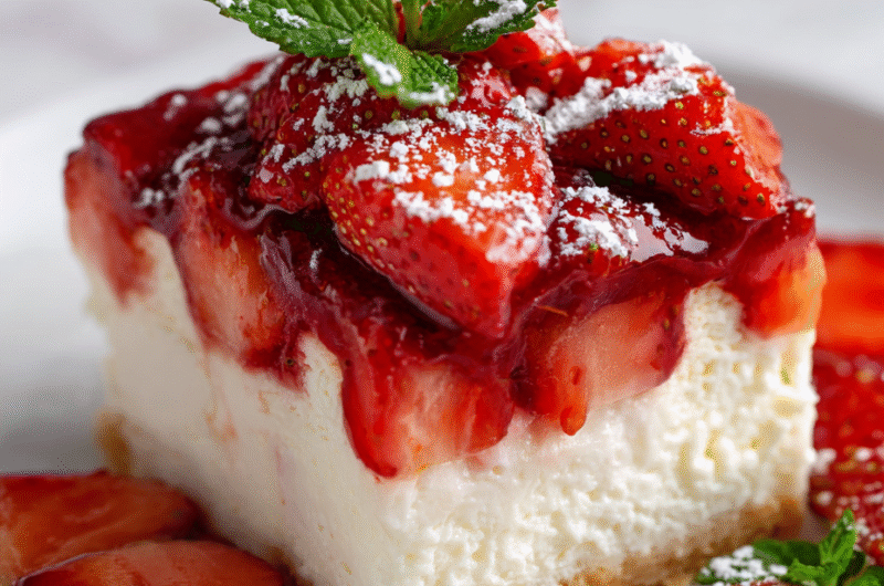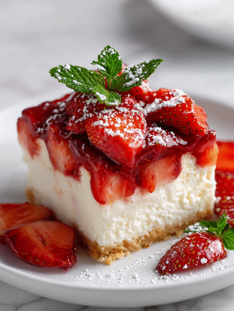 - For best presentation, clean the edges of the slices with a damp towel and plate them on a cool platter. Enjoy that burst of creamy, tangy cheesecake layered with bright strawberry goodness.