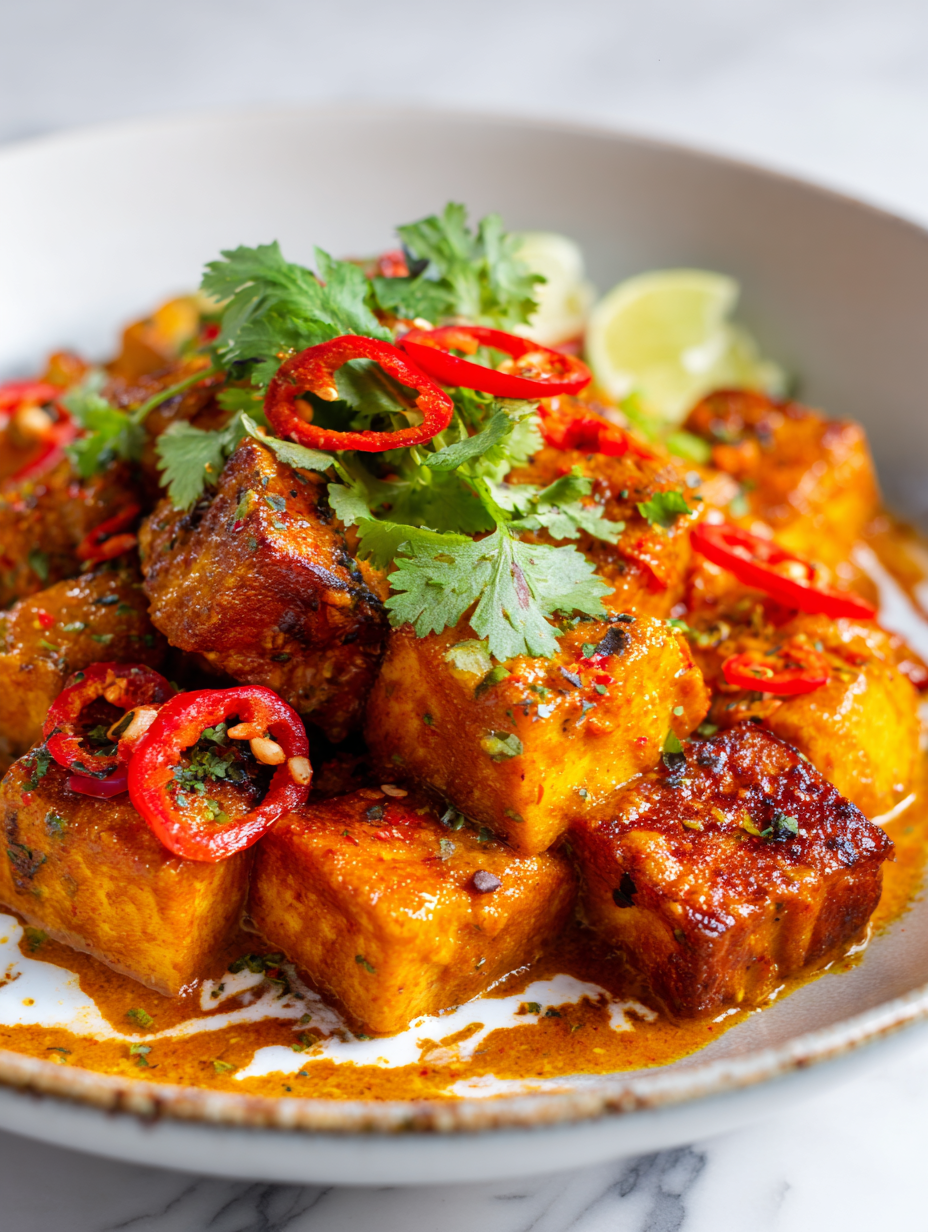 Focusing on how to balance the tofu’s sponge-like texture with a rich, smoky curry sauce that absorbs flavors deeply, creating a comforting dish that feels both hearty and surprisingly delicate.